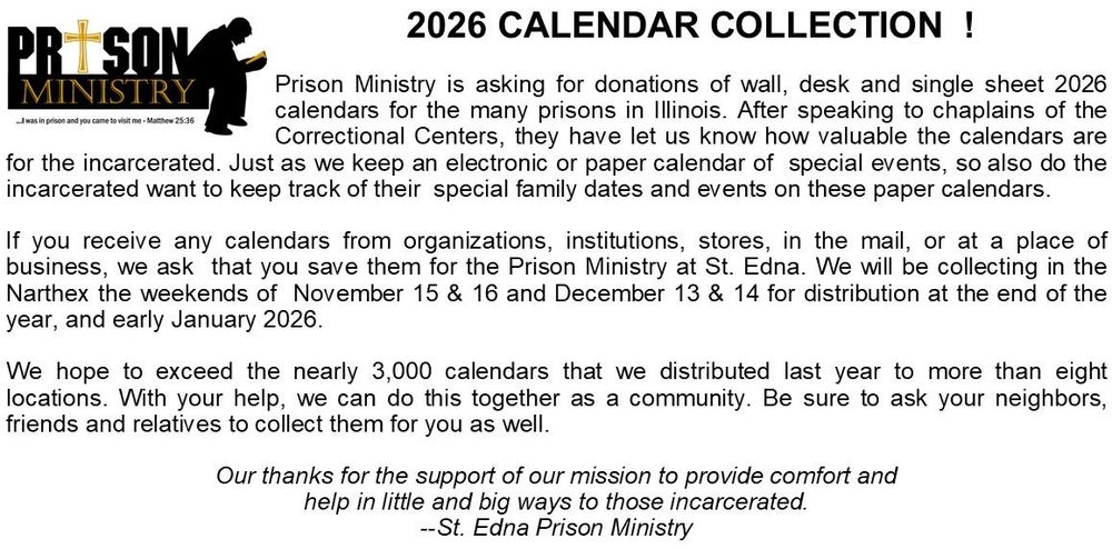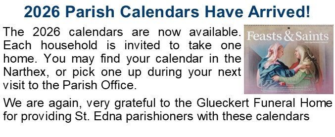 Our new Mission Statement encompasses all of the above and should be an inspiration for parishioners to deepen their commitment in making St. Edna Parish a community where all are welcomed and strengthened in their faith.